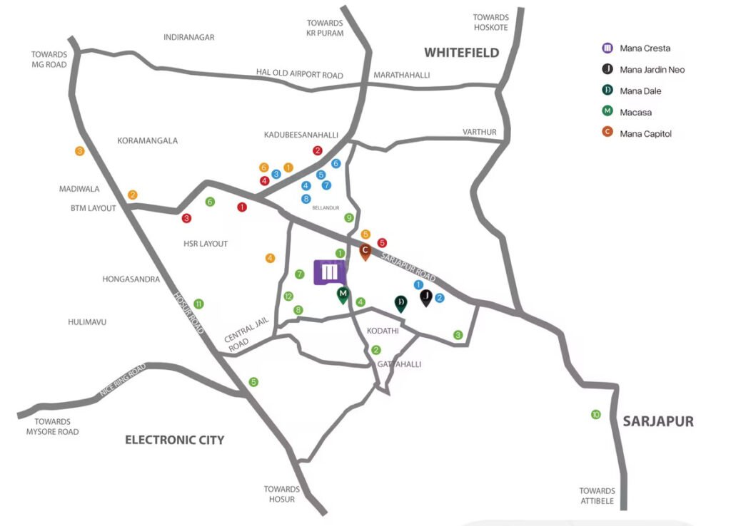 Location: Mana Cresta is located Off Sarjapur Road, Chikkanayakanahalli, in East Bangalore. The project is just 5 minutes away from Harvest International School and 10 minutes away from Glentree Academy. Delhi Public School is just 8 minutes from the project, while Primus Public School is a quick 39-minute drive. The location offers excellent connectivity to IT parks, shopping centers, hospitals, and other important destinations. The project provides seamless access to Whitefield, HSR Layout, Marathahalli, Koramangala, and Bellandur, making it an ideal choice for professionals and families a like.& other important destinations.