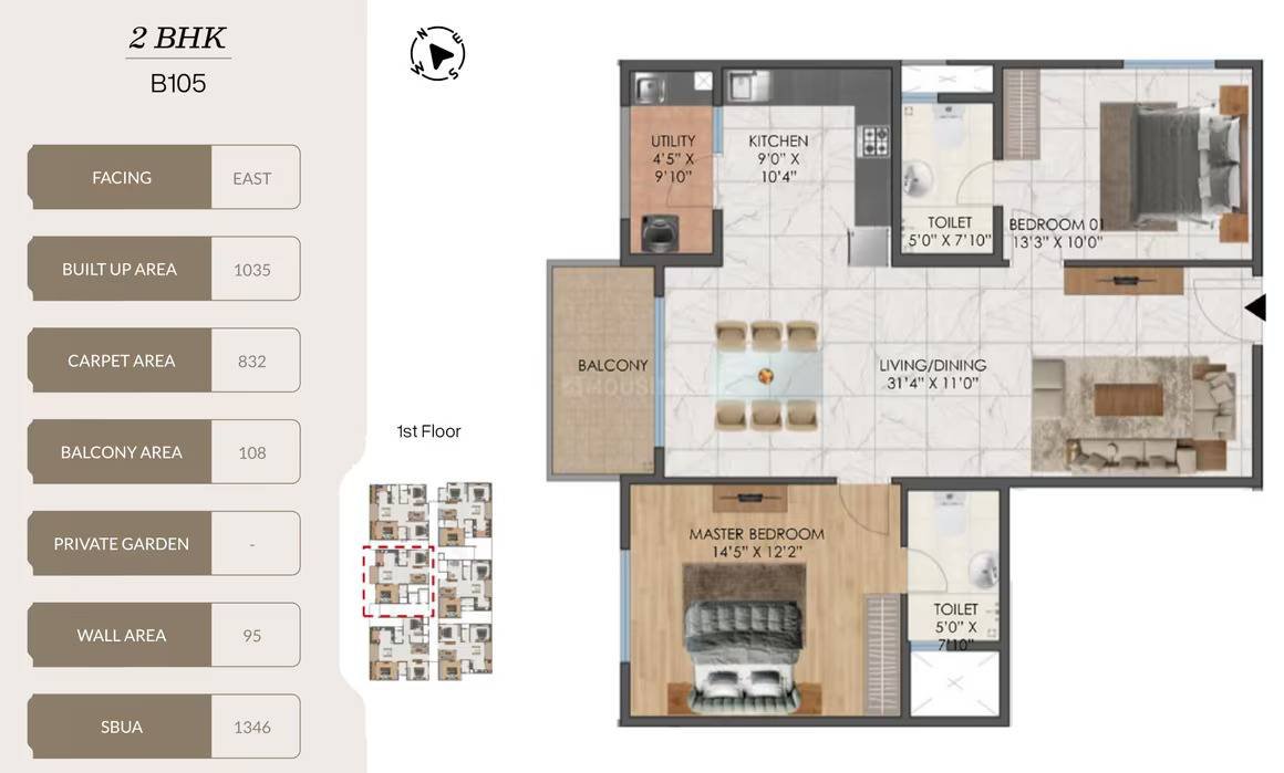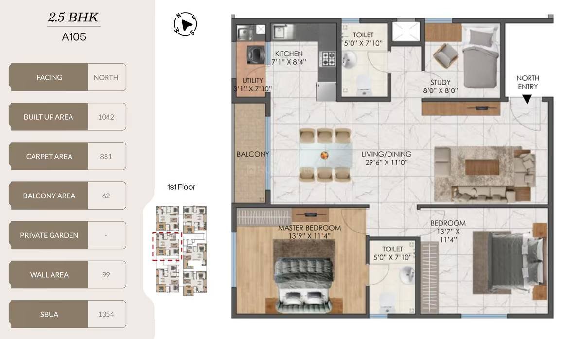 Premium 2.5, 3, and 3.5 BHK Apartments with Vastu-Compliant Square Floor Plans Ranging from 1354 to 1749 Sqft.