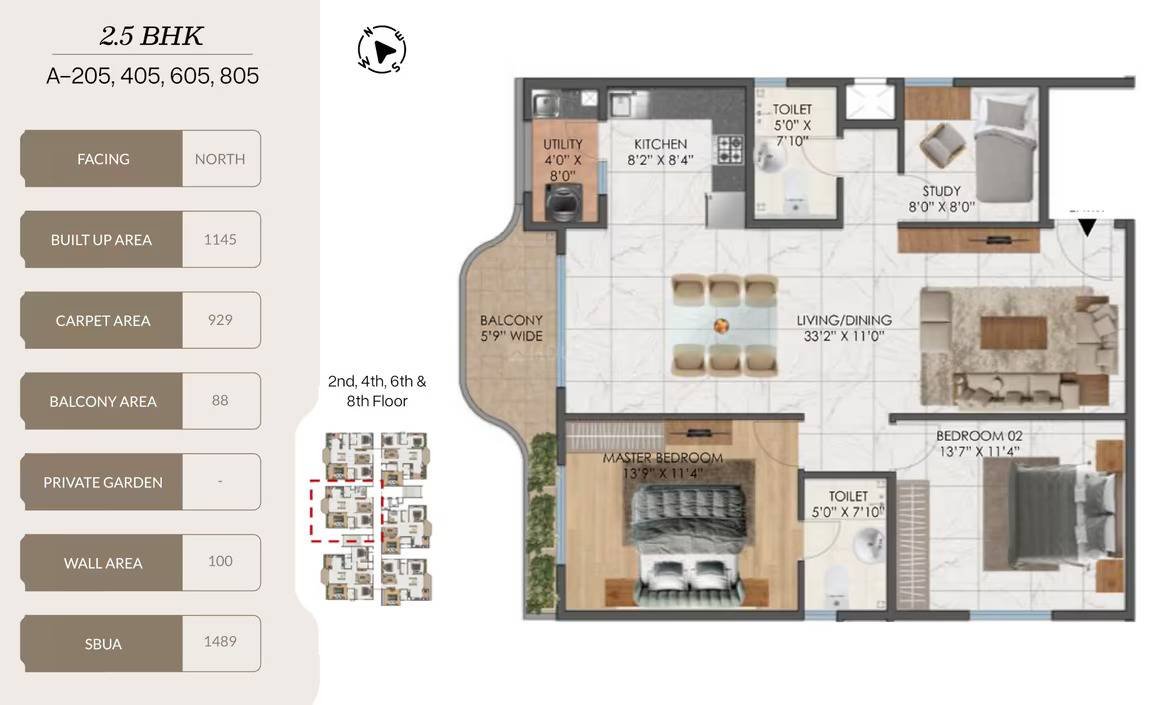 | 2.5 BHK (West Facing) | 1354–1489 Sqft | |